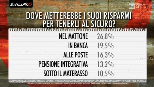 E nei confronti della banche i cittadini italiani stanno progressivamente perdendo la fiducia: infatti, per il 59,9% la banca non è un posto sicuro per conservare i propri risparmi. Dove conviene investire quindi? Per il 26,8% nei beni immobili, mentre per il 10,5% è più sicuro metterli sotto il materasso.