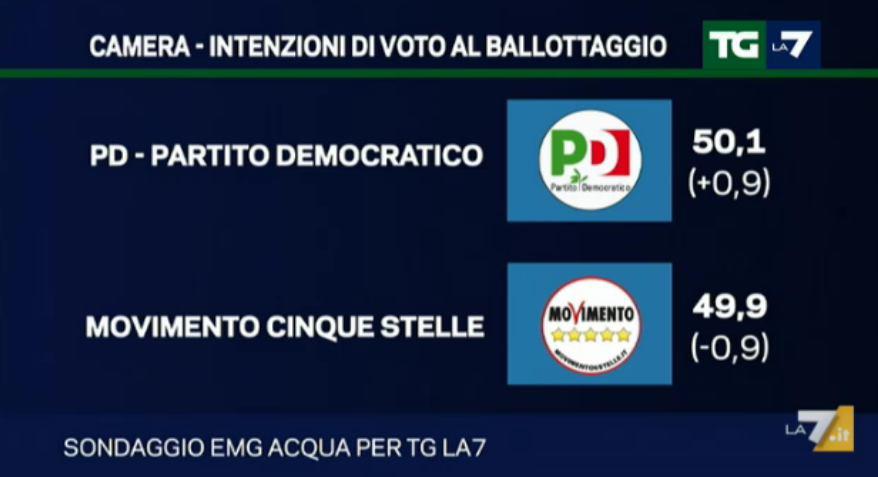 Vediamo come il sondaggio politico di EMG metta a confronto in un eventuale ballottaggio il M5S con il Partito Democratico, ed è qui la sorpresa, vediamo infatti come il partito di Matteo Renzi sembra vincere per un soffio la sfida con il 50,1%, di poco davanti al M5S che fa registrare un 49,9%. E’ quindi battaglia aperta tra le due coalizioni, che con questi risultati lasciano un velo d’incertezza su un eventuale vincitore definitivo.