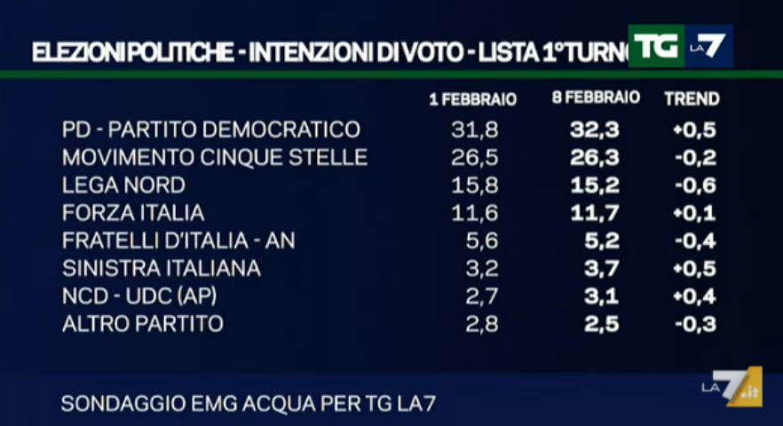 Dopo aver pubblicato i sondaggi politici di Demopolis per l’Espresso, oggi ci soffermiamo nell’analizzare gli ultimi dati, per quanto riguarda i sondaggi elettorali, commissionati dal Tg La7 di Enrico Mentana all’istituto EMG, che come tutte le settimane ci fornisce un quadro dettagliato delle intenzione di voto di un ampio campione di riferimento dell’elettorato attivo.