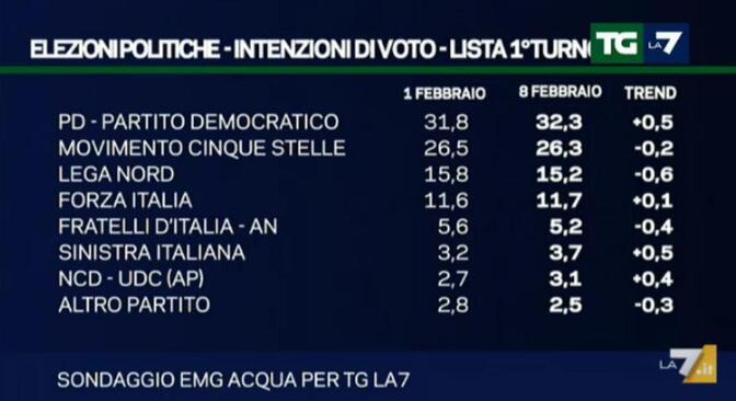 Il quadro che emerge dal sondaggio politico di EMG, lascia ben intravedere come sia sempre il PD il partito con il maggior numero di consensi, che rispetto ai datti della scorsa settimana guadagna mezzo punto percentuale attestandosi a quota 32,3%, aumentando quindi ulteriormente le distanze dal M5S.