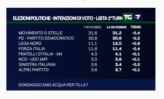 Perdono consensi sia il Movimento 5 Stelle che il Partito Democratico, con quest’ultimo che ha uno svantaggio dell’1,2% nei confronti dei grillini.