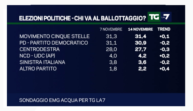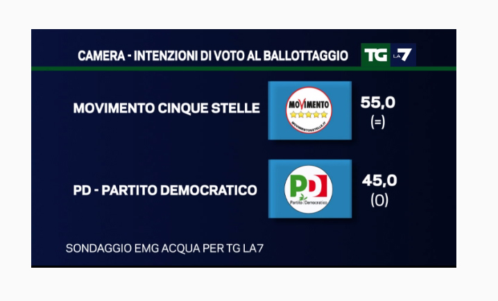 Ballottaggio che non favorisce il Partito Democratico. Se si votasse oggi con l’Italicum, infatti, sarebbero il Partito Democratico e il Movimento 5 Stelle ad andare al ballottaggio, con quest’ultimo che secondo i sondaggi politici otterrebbe la maggioranza dei voti per andare al Governo (55%).