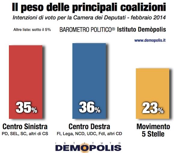 Parlando di coalizioni invece, in questo momento il Centrodestra otterrebbe la maggioranza con il 36% delle preferenze, mentre il centrosinistra si fermerebbe al 35%.