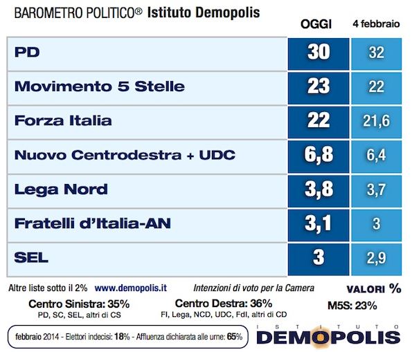Si ferma invece al 22% il partito di Berlusconi che comunque mostra una crescita dello 0,6% rispetto ad inizio mese.