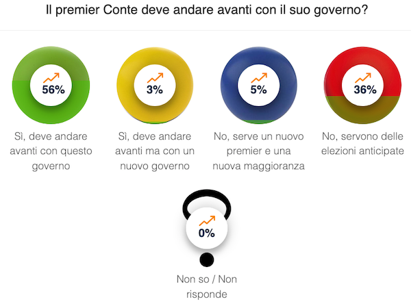 I risultati del sondaggio, che ricordiamo non ha valore scientifico ma soltanto indicativo visto che non è stato realizzato a campione, evidenziano come per il 56% dei rispondenti Conte debba andare avanti con questo governo, con un 3% che invece si è detto propenso a un rimpasto senza però cambiare premier.