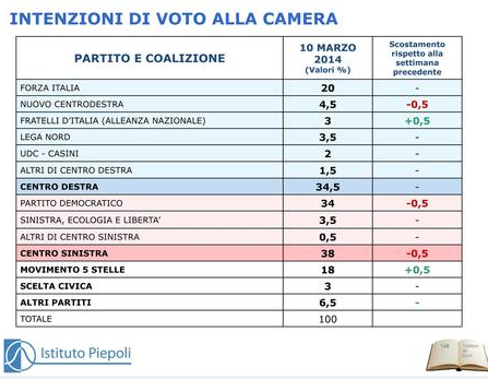 Secondo il sondaggio politico Piepoli, il centrosinistra è la coalizione più forte con il Pd primo partito. Il centrodestra è invece trainato dalla vitalità di Forza Italia. Il Movimento 5 Stelle, sceso di un punto percentuale la scorsa settimana, recupera mezzo punto ma resta ai minimi da un anno a questa parte.