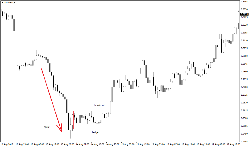 Dopo lo spike il mercato rallenta configurando una stretta congestione dei prezzi, che assume la tipica forma di un ledge (così chiamata da Joe Ross). Il momento cruciale che sancisce l’inversione della tendenza, quantomeno di breve periodo, è il breakout del ledge. Per comprendere meglio questo setup pattern, applicabile soprattutto sugli strumenti finanziari più volatili, andiamo a vedere un esempio pratico accaduto su una criptovaluta tendenzialmente iperattiva e illiquida.