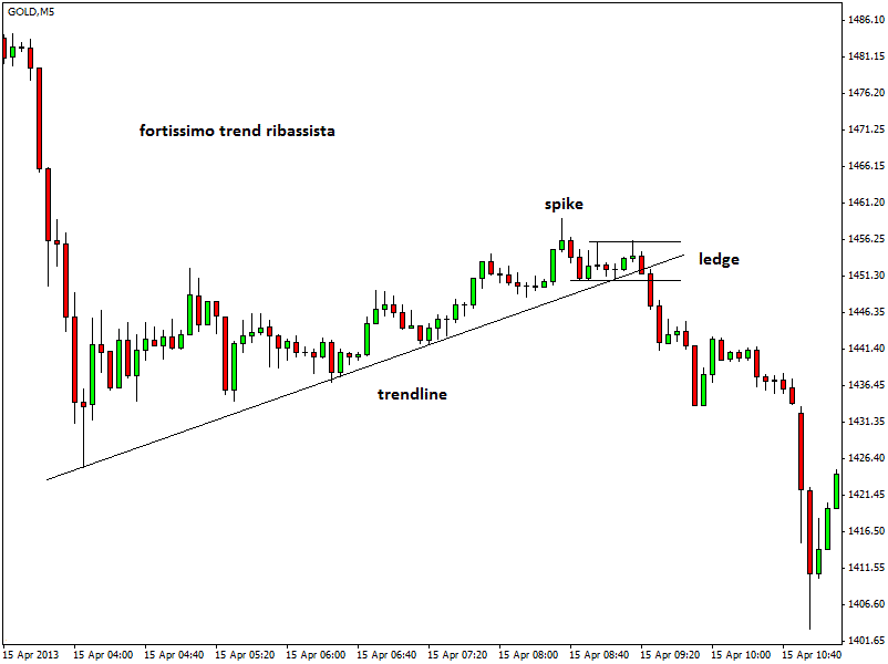 Nel case study presentato oggi sul gold, time frame a 5 minuti, si può notare un pullback dei prezzi dopo una robusta discesa delle quotazioni. La formazione dello spike & ledge aiuta il trader a mettere in piedi un trade short nella direzione del trend principale. Questo trade è stato tra l’altro suggerito nel servizio Segnali di Forex. La discesa dei prezzi sarà ancora una volta molto consistente.