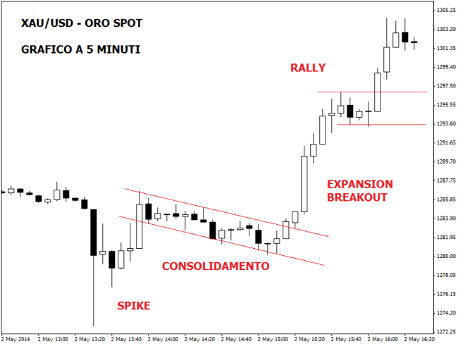 A questo punto possono salire in cattedra i compratori, che hanno campo libero per orchestrare al meglio una fase di accumulazione prima dell’inversione vera e propria del trend. Dal grafico dell’oro spot in alto (XAU/USD), si può notare la formazione di una fase di consolidamento con bassa volatilità dopo lo spike. A un certo punto avviene la rottura esplosiva delle resistenze di breve periodo: si forma un Expansion Breakout, che sancisce l’inizio di un rally molto robusto e dalle grandi potenzialità di profitto per scalper e day-trader.