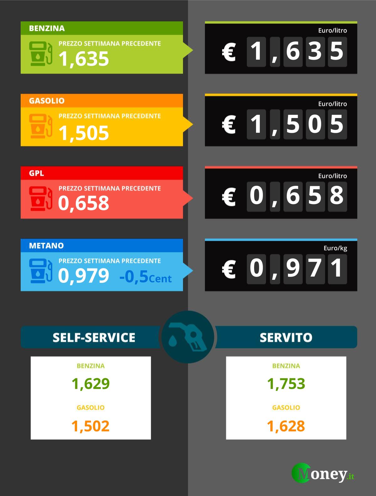 - Il prezzo della benzina rimane stabile, e rimane al pari della scorsa settimana: 1.635 euro/litro.