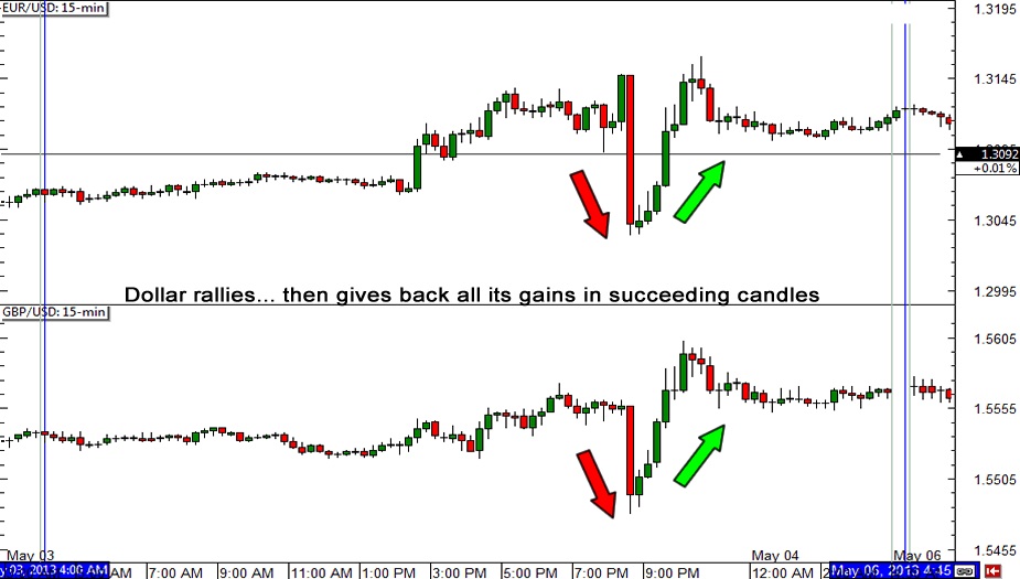 Come possiamo vedere sia dal grafico di GBP / USD che da quello di EUR / USD, il dollaro ha segnato un rally dopo la pubblicazione del dato iniziale, con le due coppie che hanno perso circa 100 e 60 pip rispettivamente. Tuttavia, il rally è durato poco, in quanto ha dato indietro tutti i suoi guadagni nelle ore immediatamente successive.