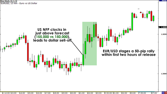 La reazione dei mercati è evidente dall’analisi riportata oggi da Babypips: dopo due ore dal rilascio dei NFP, il cambio Euro/Dollaro ha guadagnato circa 50 pips. L’esito di questo market mover ha avuto un effetto piuttosto ribassista per il dollaro americano che è stato oggetto di sell-off contro le maggiori valute, compresi i "safe haven".