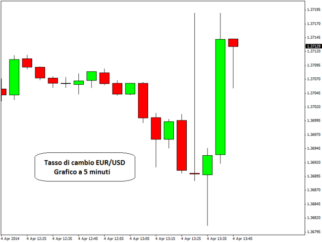 Tuttavia il dato è risultato inferiore alle aspettative, che erano ferme a 199mila unità. Rivisto al rialzo il dato di febbraio: +197mila da +175mila unità. Sotto le attese anche il tasso di disoccupazione, che è rimasto invariato al 6,7%. Gli analisti finanziari intervistati da Bloomberg avevano stimato un miglioramento al 6,6%. Sul forex il tasso di cambio euro/dollaro è stato investito da un’ondata di volatilità che ha visto i prezzi prima scendere fino a 1,3680, ai minimi da fine febbraio scorso, e poi risalire con decisione sopra 1,37. Al momento il cambio ha trovato un ostacolo tecnico in area 1,3720, ma non va escluso che possa rimbalzare ancora fino a 1,3750 – 1,3780. Impressionante la volatilità sull’oro, che prima scende a 1.283$ e poi risale a 1.303$ l’oncia.