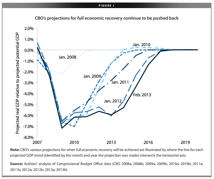 Nessuno vuole dare la colpa alla Fed, lo stesso vale per gli altri che fanno previsioni sia al governo che nel settore privato. L’Economic Policy Institute ha catturato la propensione del CBO alle proiezioni di crescita proprio dietro l’angolo, nel grafico sottostante, da un documento informativo pubblicato la scorsa settimana. In sostanza, questo dimostra che, mentre gli anni sono passati, il CBO continua sempre di più a spingere indietro i tempi di una vera e propria ripresa, il momento in cui la produzione dell’economia statunitense tornerà alle sue potenzialità. All’inizio del 2009, il CBO pensava che si sarebbe tornati alla piena occupazione in pochissimo tempo; nella previsione rilasciata all’inizio di questo mese, ciò corrispondeva al 2016 o 2017.