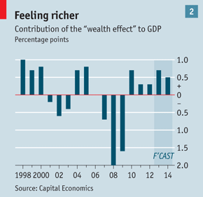 Il lato positivo è il diffuso recupero del mercato immobiliare. Nel mese di Gennaio le vendite di nuove case hanno raggiunto il loro livello più alto dal 2008. L’aumento dei prezzi delle case e una borsa a livelli quasi da record hanno aggiunto 4.800 miliardi di dollari alla ricchezza delle famiglie lo scorso anno, calcola Paul Dales di Capital Economics, portandola a circa $ 65 miliardi di dollari, vicino al suo picco pre-crisi. Egli calcola che l’effetto ricchezza" dovrebbe sollevare la spesa dei consumatori in modo sufficiente ad aggiungere 0,7% al PIL quest’anno.