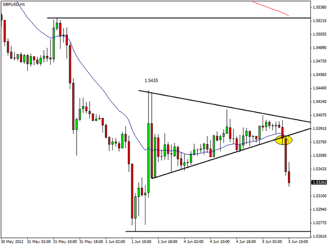 Il tasso di cambio sterlina/dollaro ha messo il turbo verso il basso a seguito del breakout ribassista sul triangolo a 4 ore. La rottura è stata davvero esplosiva e da 1,5380 (mio livello di short entry) si è giunti fino a 1,5320. Dopo essere passato ad una gestione sul chart a 5 minuti, ho preso posizione sul 75% della posizione short a 1,5332. Il resto della posizione è chiaramente in free-trade. L’indicazione short sul cable era già stata fornita in mattinata nel consueto report delle ore 8.