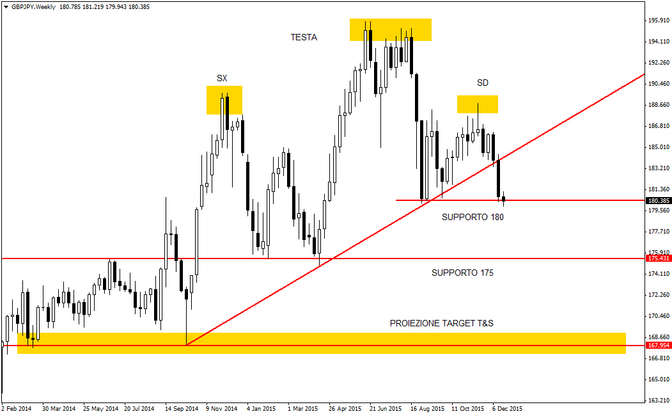 Siamo al cospetto della neckline di medio periodo di un bearish Head & Shoulders, che da un punto di vista grafico identifica una probabile inversione del trend. La proiezione del target del pattern è in area 165, ovvero il 9% in meno rispetto ai valori correnti. Al momento l’ipotesi bearish appare possibile, considerata la difficoltà della sterlina di risollevarsi dai supporti e la forza dello yen provocata dall’aumento dell’avversione al rischio sui mercati finanziari globali. Inoltre, gli investitori sembrano non apprezzare il fatto che la Bank of Japan potrebbe non lanciare il QE2 nel corso del 2016.
