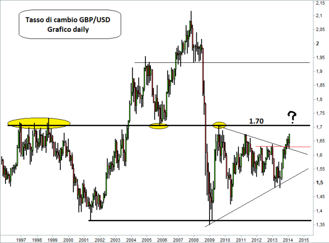 Nell’ultima ottava il cable si è apprezzato quasi del 2% e a questo punto sembra avere tutte le carte in regola per puntare con decisione verso l’area chiave di resistenza di 1,70. Si tratta di un livello tecnico molto importante, che già in passato è riuscito a decretare svolte del mercato decisive nel medio periodo. La prima sensazione è quella di un rallentamento della corsa rialzista proprio al raggiungimento di questo key level, altrimenti per il cable si aprirebbero clamorosi scenari bullish di medio-lungo periodo verso 1,90 – 1,95.