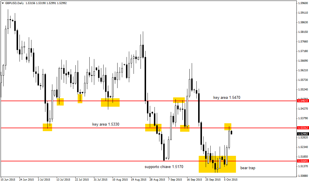 Si tratta del primo ostacolo tecnico importante per i Tori, che comunque di recente hanno già messo in grandi difficoltà gli Orsi confezionando una netta “bear trap” sul breakout ribassista del supporto chiave di 1,5170. Il rialzo potrebbe proseguire ancora, ma difficilmente andrà oltre la resistenza chiave di 1,5470. La sterlina dovrebbe continuare a mostrare alti e bassi da qui a fine anno, considerando che negli ultimi mesi l’economia britannica ha mostrato segnali di rallentamento inattesi che dovrebbero posticipare ulteriormente l’incremento dei tassi di interesse in Gran Bretagna dall’attuale minimo storico dello 0,5%.