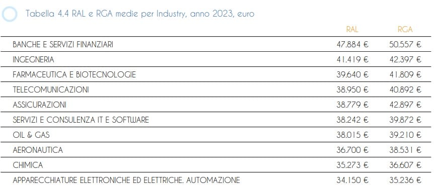 Infine, volendo spacchettare ulteriormente i dati e considerare RAL e RGA (Retribuzione Globale Annua Lorda) medie per settore e il posizionamento rispetto alla media nazionale, questi sono i comparti specifici che hanno pagato di più nel 2023 in Italia: