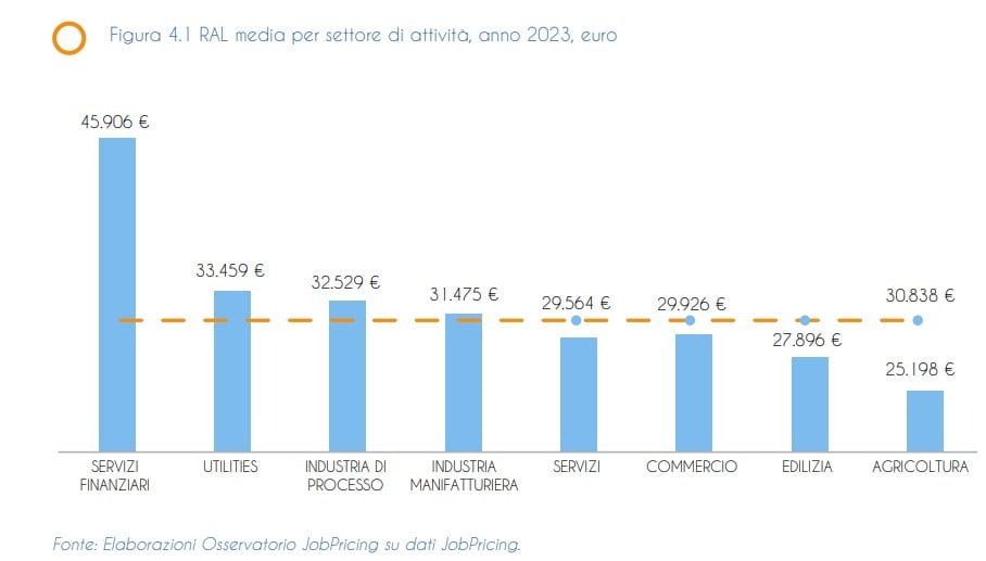 Fatta questa premessa, gli stipendi più alti nel 2023 sono stati pagati in questi settori: servizi finanziari, utilities, industria di processo. Considerando la media nazionale della RAL lorda a 30.838 euro, ecco come si sono posizionati i vari comparti. Il calcolo è dato dalla RAL media: