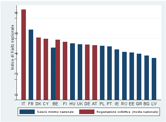 Il grafico sottostante si riferisce al biennio 2007-2009 ed evidenzia come i Paesi in cui vige la negoziazione collettiva hanno, mediamente, salari minimi più elevati rispetto a quelli in cui esiste un salario minimo nazionale, in proporzione al salario medio (con riferimento all’indice Kaitz, che esprime l’incidenza del salario minimo sul salario medio).