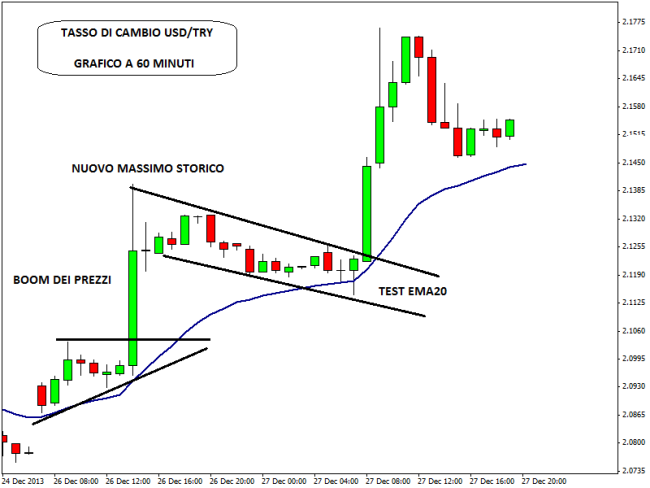 Se si osserva il chart a 60 minuti del tasso di cambio Usd/Try, ovvero dollaro americano su lira turca, possiamo notare un boom dei prezzi che porta alla formazione di un nuovo massimo storico. Successivamente prende il via un pullback con bassa volatilità. I prezzi scendono fino a toccare la EMA20, dove si forma una pin candle di continuazione del trend primario. Il breakout rialzista dei prezzi offre al day-trade un’ottima opportunità di profitto.