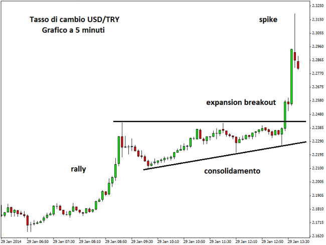 In genere lo slim jim si utilizza per fare scalping intraday. Va ricercato durante le giornate ad ampio range sui quei tassi di cambio che evidenziano robusti rally intraday e una grande capacità di mettere a segno accelerazioni notevoli, grazie a un’elevata volatilità intrinseca. Per capire meglio la strategia si può dare un’occhiata all’esempio sul cambio USD/TRY, time frame a 5 minuti: i prezzi hanno registrato un boom eccezionale dopo un lungo trading range, dopo che in mattinata era avvenuto un rally molto significativo.