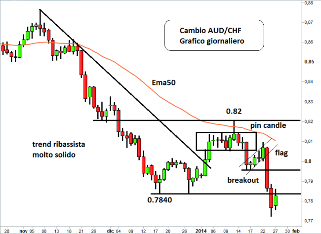 Nel grafico in alto relativo al cross AUD/CHF, ovvero dollaro australiano su franco svizzero, time frame giornaliero, possiamo notare la formazione di una Lizard su una key-area molto importante posta a 0.82 e sui livelli della media mobile a 50 giorni. La presenza di resistenze statiche e dinamiche è un elemento in più per valutare il potenziale tasso di successo dell’operazione. In effetti la Lizard segna un massimo di breve periodo importante e da questi livelli il mercato non fa altro che scendere fino in area 0.77.