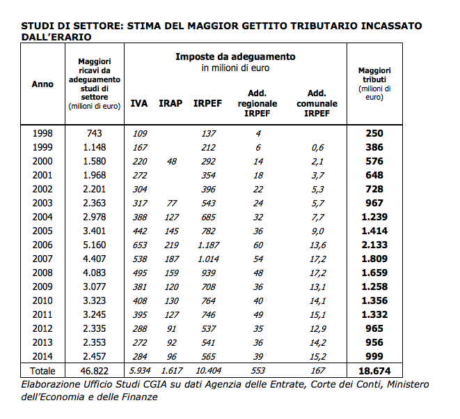 Rispetto a questo secondo punto di seguito una tabella che riporta anno per anno tutti i volumi di maggior gettito ottenuti dallo Stato grazie agli studi di settore:
