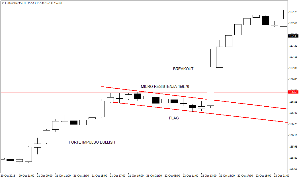 Il grafico in alto è basato su un time frame a 60 minuti, ideale quindi per l’attività di day-trading. Si può notare che, dopo un forte impulso rialzista, i prezzi iniziano a configurare un ritracciamento con bassa volatilità che va a identificare una tipica “flag” (bandiera). E’ un segnale di continuazione del trend in atto, per cui al breakout del top di periodo scatterà una long di breve termine. La rottura rialzista avviene poche ore dopo e la quotazione aumenterà con decisione.