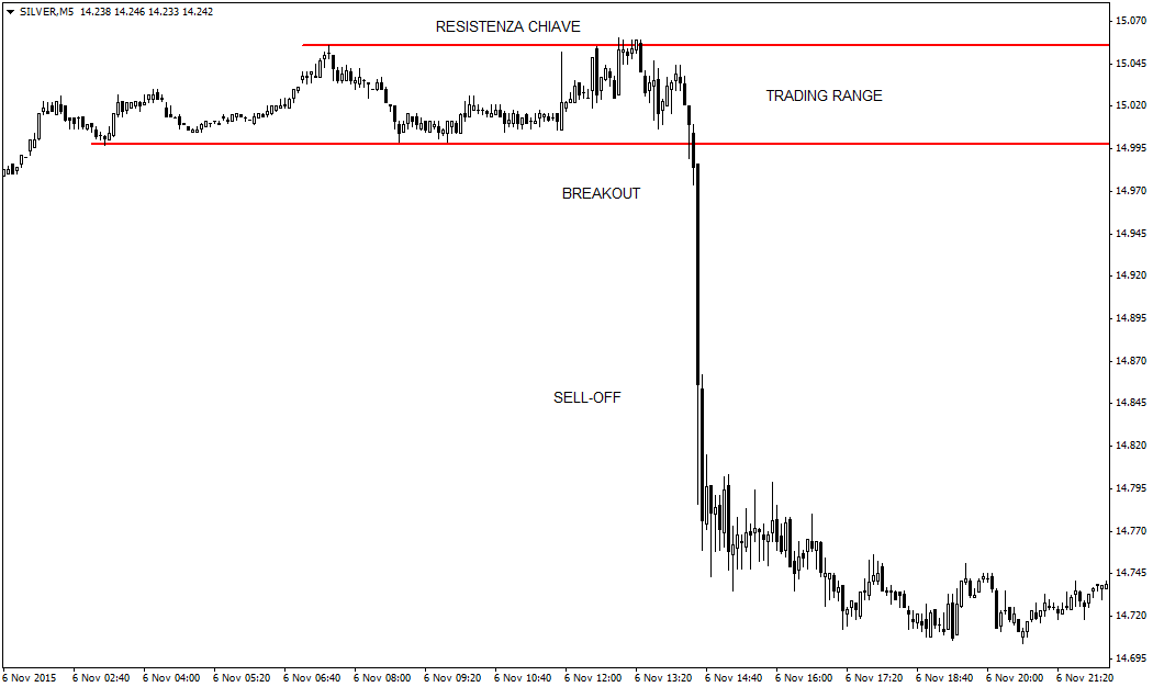 I grandi breakout del prezzo sono spesso la conseguenza di lunghe ed estenuanti fasi laterali, che all’improvviso provocano esplosioni verso l’alto o al ribasso delle quotazioni in grado di mettere a punto movimenti direzionali al dir poco esaltanti. E’ il caso del mercato dell’argento, analizzato nel grafico in basso sul time frame a 5 minuti. Si può notare subito la presenza di un trading range, che dura davvero tantissime ore.