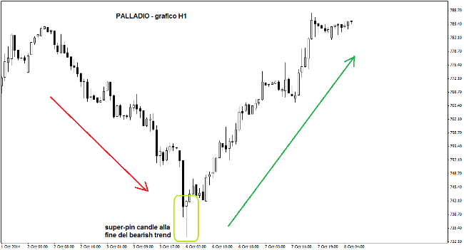 Quanto più la coda è pronunciata, tanto meglio è. Infatti la lunga coda identifica l’esaurimento della tendenza di fondo e offre al trader la possibilità di entrare sul mercato con le probabilità a proprio favore. Una super pin candle è, ad esempio, quella mostrata nel grafico in alto sul palladio, un metallo con utilizzo nel settore industriale. Dall’hourly chart (H1) si può notare la comparsa di una spettacolare pin candle di tipo reversal, alla fine di un trend ribassista molto solido. Da area 740$ il valore del palladio aumenta fino a 790$ circa in un paio di giorni.