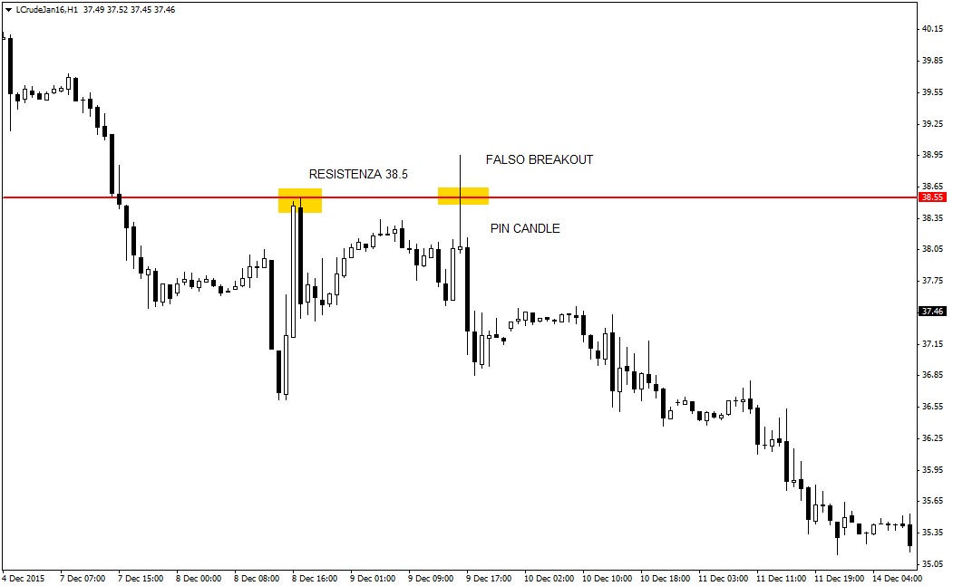 Il breakout rialzista, però, si rivelerà ben presto un fallimento, tanto da formare una bull trap. I trader che avevano puntato sullo short devono chiudersi il più velocemente possibile per evitare guai peggiori. Graficamente appare una netta pin candle, caratterizzata da un piccolo corpo (real body) e da una coda superiore molto pronunciata, che avvalora sempre più la tesi di un esaurimento della spinta dei Tori e di un ritorno di fiamma degli Orsi. Nelle pre successive avverrà un crollo fino in area 35 dollari al barile.