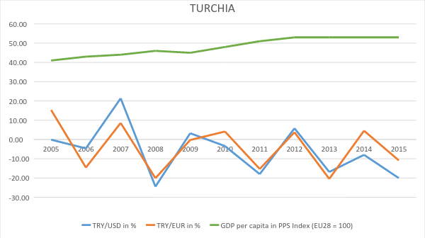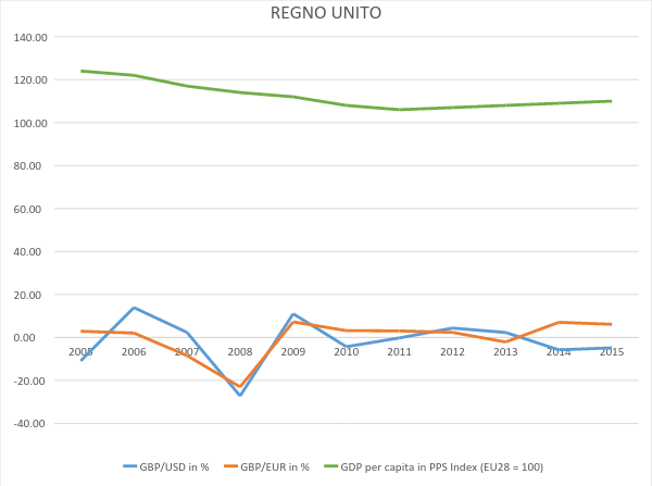 Con queste doverose premesse tecniche, verifichiamo quindi come la “qualità della vita”, misurata come ci suggerisce l’Eurostat, è variata nel Regno Unito ed in Turchia, cercando di focalizzare l’attenzione soprattutto sui periodi in cui le rispettive divise si sono svalutate nei confronti di dollaro ed euro.