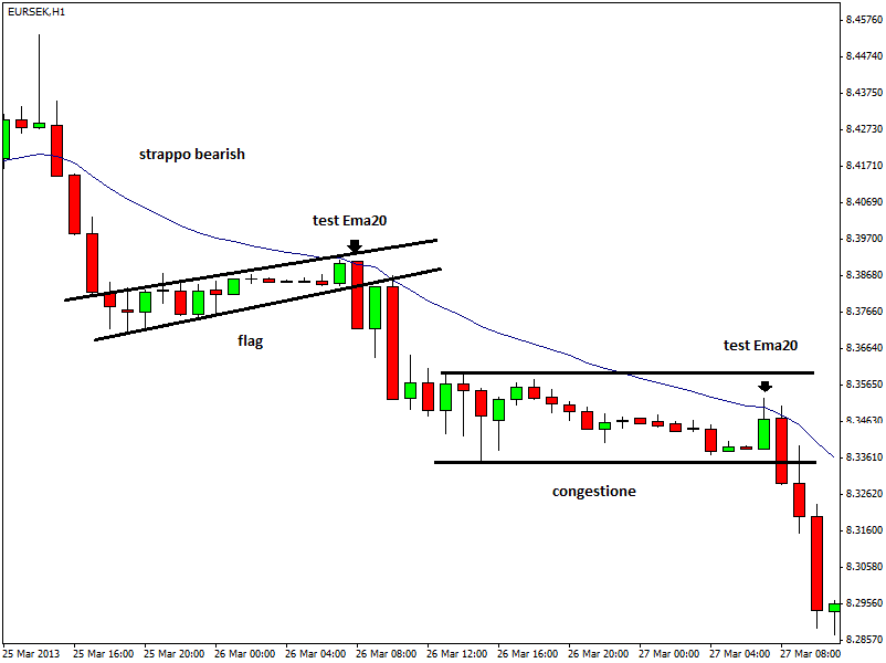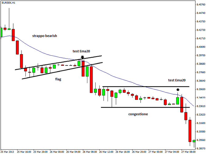 Questo pattern deve essere ricercato quando il mercato mette a segno uno strappo molto evidente (magari con una serie di candele ad ampio range) e poi inizia un ritracciamento con bassa volatilità. Il contatto con la Ema20 è un segnale di swing trading molto forte e consente al trader di entrare nella stessa direzione del trend primario con un rapporto rischio/rendimento molto favorevole.