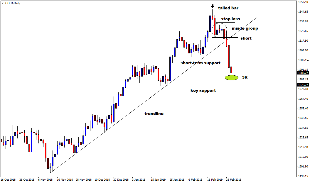 Il grafico mostrato in basso sul Gold, time frame giornaliero, evidenzia un eccezionale trend rialzista da area 1.200$ a quasi 1.350$ nel giro di tre mesi e mezzo. Questo boom può essere seguito con precisione quasi millimetrica con una trendline. A un certo punto, però, a pochi dollari di distanza da una zona di resistenza weekly molto importante, si forma una tailed bar seguita immediatamente da una long candle ribassista. Per la candlestick analysis si tratterebbe di una three rivers evening star (anche se la NRB non presenta un’apertura in gap, che comunque è un evento piuttosto raro sul Forex).