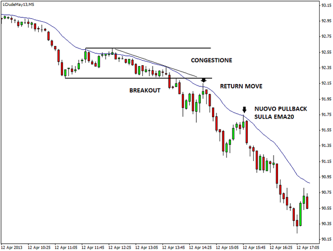 Dopo il breakout dei prezzi avviene un return move, che evidenzia come i venditori abbiano ormai preso il controllo della situazione. Lo scalper o il day-trader può intervenire sul pullback sulla EMA20, che rappresenta uno dei punti migliori per entrare lungo un solido trend direzionale. Dopo il breakout ci sono due opportunità per entrare con questa strategia.
