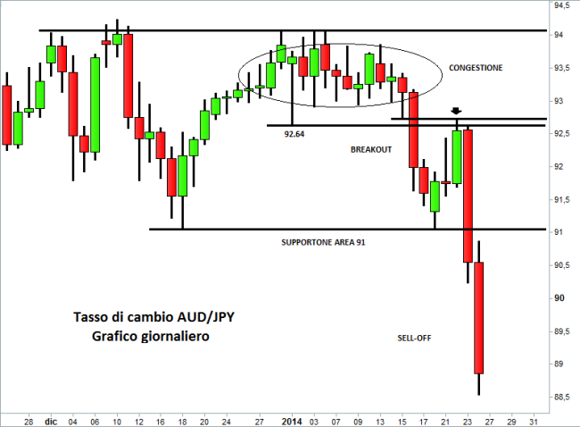 Nel grafico giornaliero mostrato in alto e relativo al tasso di cambio AUD/JPY, ovvero dollaro australiano su yen giapponese, si può notare come i prezzi siano tornati su un’area chiave (posta intorno a 92,70), a seguito del breakout ribassista esplosivo di questa stessa area in precedenza supporto di breve termine. Su questi livelli sono partite raffiche di vendite, mentre alla rottura di un’altra area chiave (il supportone di 91) è avvenuta un’impressionante accelerazione delle quotazioni.