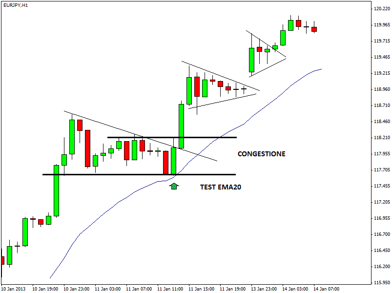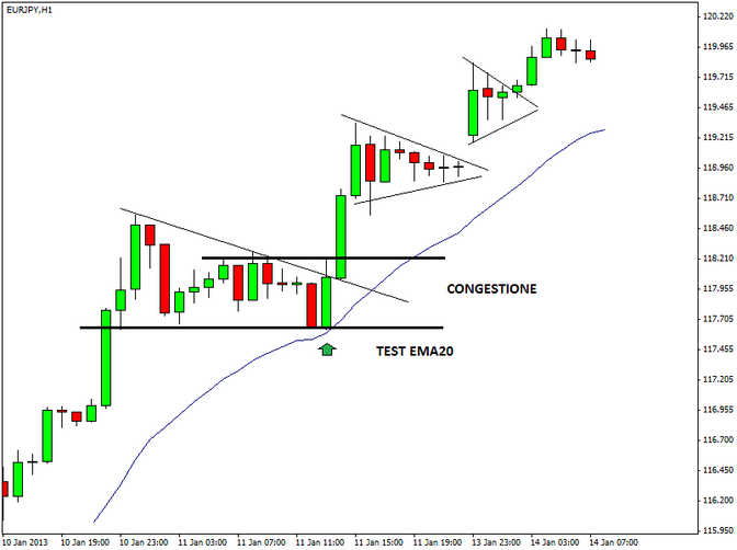 Oggi vediamo un interessante case study relativo al tasso di cambio euro/yen, grafico a 60 minuti, che ci permette di individuare un setup di ingresso sul mercato lungo un forte trend direzionale rialzista. Dopo un forte strappo del mercato su base daily, i prezzi iniziano una fase di consolidamento ben visibile sul grafico a un’ora. Si forma una congestione, non molto lontano dai top di periodo.