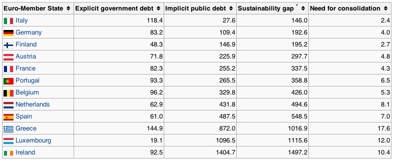 - Nell’indicatore della sostenibilità del debito a lungo termine del FMI, l’Italia è al primo posto, a 4.1, prima del 4,6 della Germania, 7,9 della Francia, 13,3 del Regno Unito, 14,3 del Giappone, e 17 degli Stati Uniti. Un approccio alternativo per la valutazione del debito a lungo termine, comprensiva del il debito implicito (come promesse pensionistiche, ecc), mostrerebbe un risultato italiano ancora migliore.