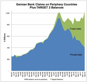 - Se, secondo Münchau, l’Italia dovesse fallire, la Germania dovrebbe accettare miliardi di perdite dal sistema Target2. Il Target2 in precedenza era solo un meccanismo tecnico di compensazione tra gli Stati membri dell’area dell’euro. Grazie alla discussione, che ha iniziato Hans Werner Sinn, Münchau e il pensiero economico comune hanno accettato il fato che quando un paese lascia l’euro, le passività Target2 del paese uscente vanno in scadenza. Al fine di spaventare i lettori tedeschi, Münchau indica il caso peggiore, cioè che l’Italia non pagherà per niente i suoi debiti Target2.