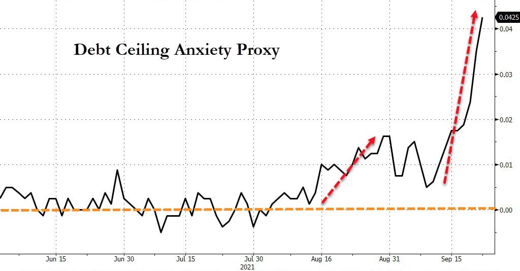 il quale mostra il proxy di tensione del mercato rispetto all’approssimarsi della scadenza del tetto di debito Usa. Ovviamente, l’idea di un default statunitense esiste soltanto ipoteticamente e sulla carta ma è il principio perverso su cui ormai si basa il deficit spending strutturale a offrire una visione differente della realtà. L’intero circo del debito è totalmente dipendente dal regime di espansione del denaro a costo zero e dei tassi inchiodati al livello attuale. Se cambia la dinamica, il collasso è assicurato.