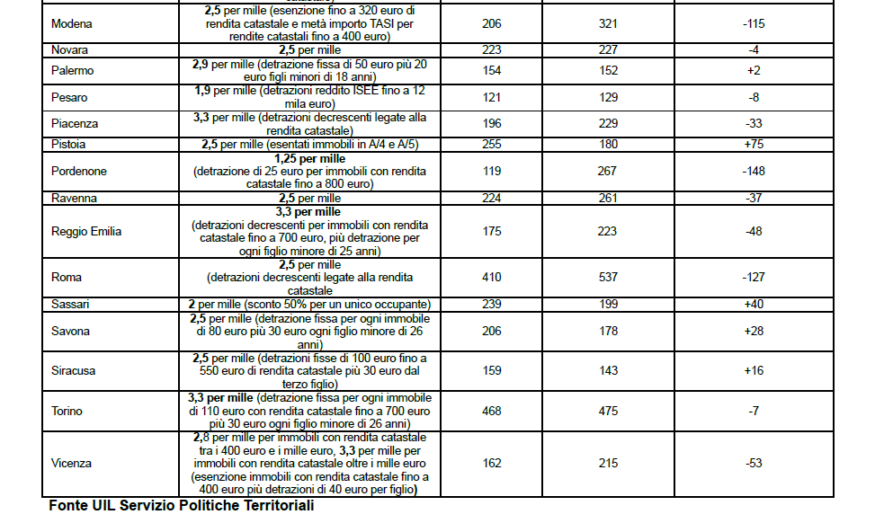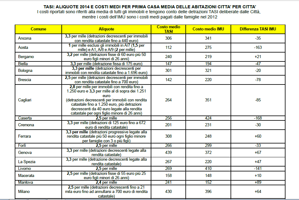 Per cercare di capirci qualcosa dunque vi proponiamo una tabella fornita dalla UIL Servizio Politiche Territoriali che analizza le aliquote Tasi 2014, i costi medi per ogni città, e la differenza con l’IMU: