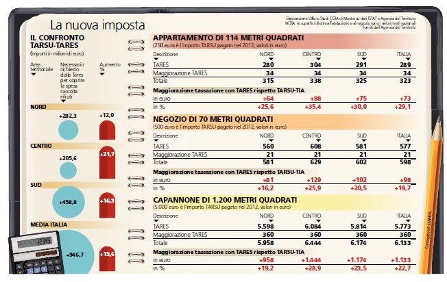 Una cosa è certa per il momento: il Codacons ha stimato un aggravio di circa 77 euro a famiglia (ad esempio a Milano l’incasso Tares 2013 sarà pari a 288,9 milioni di euro, ovvero +8,9% rispetto alla Tarsu 2012).