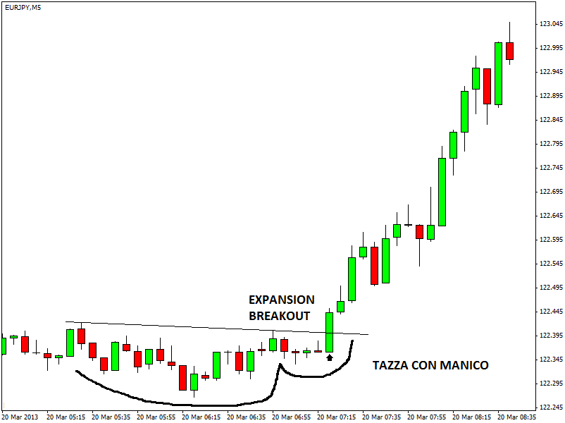 Oggi andiamo a studiare un case study relativo alle fasi di acumulazione/distribuzione del trend. L’esempio mostrato sul tasso di cambio euro/yen, grafico a 5 minuti, è riferito a una tazza con manico (cup with handle) che appare sui minimi di giornata. Si tratta di una fase di accumulazione, caratterizzata da bassa volatilità, che chiaramente ha la forma di una tazza con il manico.