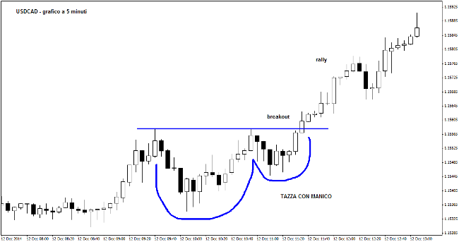 Il grafico mostrato in alto sul tasso di cambio USDCAD, ovvero dollaro americano su dollaro canadese (il cosiddetto Loonie), time frame a 5 minuti, mette in evidenza una classica tazza con manico che prende il via dopo un iniziale rally del mercato verso l’alto. Da quel momento si formano due fasi di accumulazione (la prima è la tazza, la seconda è il manico), che culminano dopo alcune ore con il breakout della resistenza intraday. La rottura dell’area chiave del mercato favorirà un interessante rally.