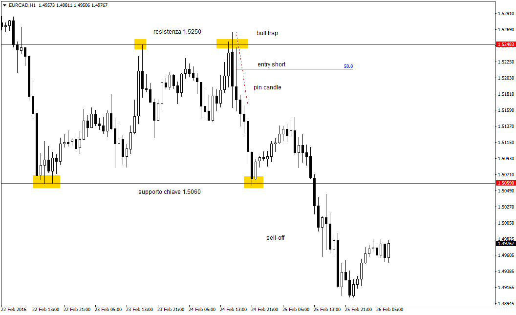 Il grafico mostrato in alto si riferisce al tasso di cambio EUR/CAD, time frame intraday a 60 minuti, sul quale si forma un segnale short in zona di resistenza (Bull Trap con candela outside).
