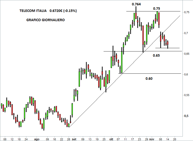 Telecom Italia è stata bocciata nella giornata di ieri al livello "junk", ovvero spazzatura, dall’agenzia di rating americana Standard & Poor’s. Alla borsa di Milano il titolo del gruppo telefonico ha chiuso la seduta con un lieve ribasso dello 0,15% a 0,672€. Negli ultimi giorni il trend rialzista, iniziato sul finire di agosto scorso, ha cominciato a mostrare segnali di cedimento, dopo la formazione di un’area di massimo tra 0,753€ e 0,764€.