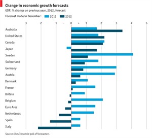 Come potete vedere dal grafico, il declino dell’Italia è piuttosto evidente: se lo si confronta con le lievi riduzioni degli altri Paesi (a parte Stati Uniti, Giappone e Australia, che hanno migliorato le prospettive di crescita nel 2012), il crollo italiano risulta piuttosto imbarazzante. Il 2012 figura così come un annus horribilis per il Pil italiano, mentre il 2013, assicurano gli analisti, potrebbe presentare uno scenario migliore. A patto che l’Italia raccolga le sfide che costellano il suo percorso. O, forse, a patto che l’Italia esca dalla moneta unica, come esorta il Telegraph, per risolvere i suoi problemi senza fine.
